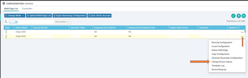 3.选择您决定使优先级较低的特定设备(例如vEdge 1)。 滚动到行的右端,单击三点选项,然后选择更改设备值。