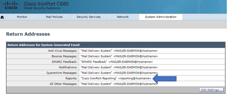 在ESA/CES GUI上,导航到系统管理>返回地址,如下图所示: