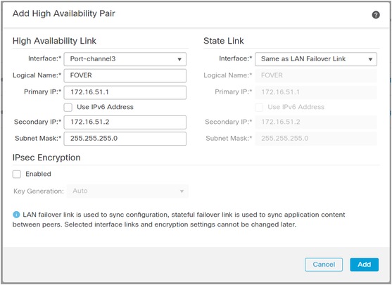 警告:确保选择正确的设备作为主设备。所选主设备上的所有配置都将复制到所选辅助FTD设备。通过复制,可以替换辅助设备上的当前配置。