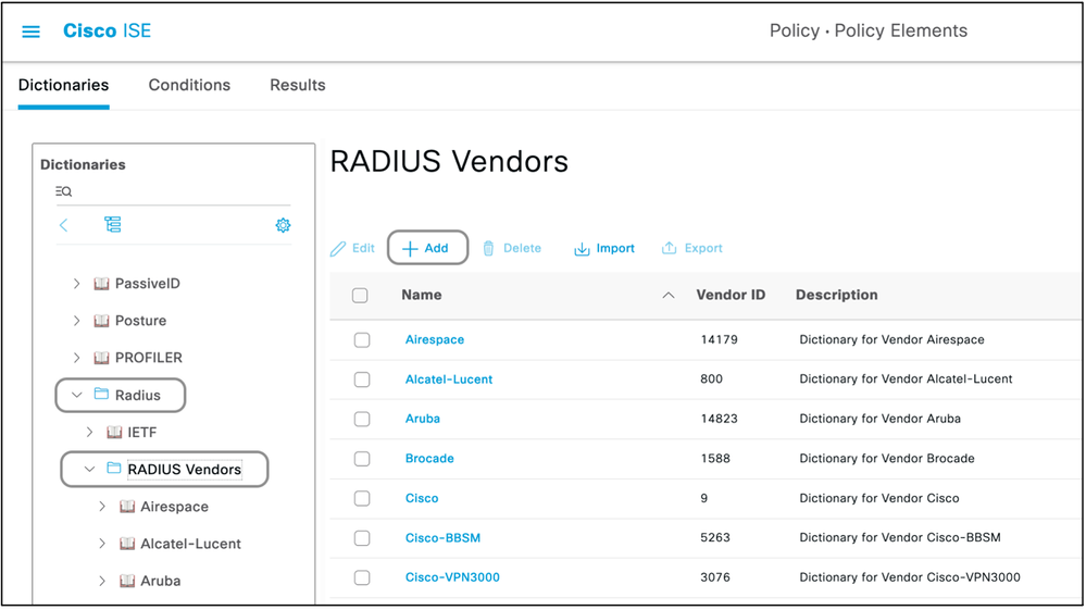 注意:并非所有供应商都要求添加特定词典。如果供应商可以使用由IETF定义的RADIUS属性(在ISE中已存在),则可以跳过此步骤。