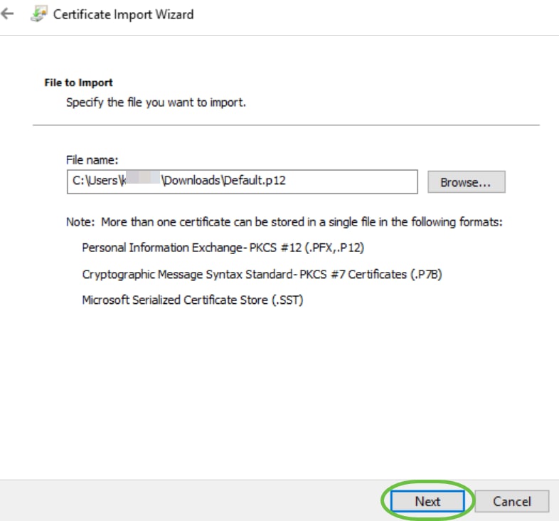在下一个屏幕上,选择Place all certificates in the following store,然后单击Browse。