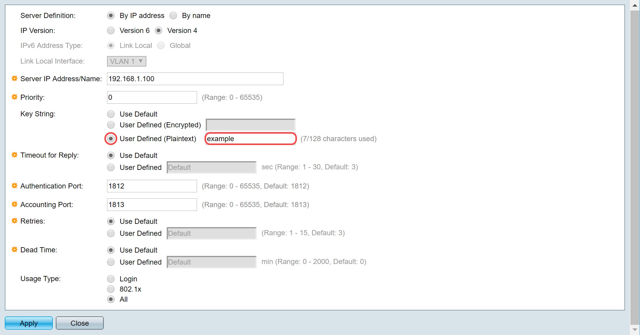 步骤7.输入用于验证和加密设备与RADIUS服务器之间通信的密钥字符串。此密钥必须与RADIUS服务器上配置的密钥匹配。可以以加密或明文格式输入它。如果选择Use Default,设备将尝试使用默认密钥字符串向RADIUS服务器进行身份验证。我们将使用“用户定义(明文)”并在关键示例中输入。