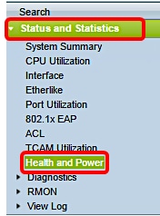 步骤1.登录到交换机的基于Web的实用程序,然后选择状态和统计信息>运行状况和电源。