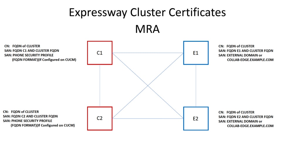 如果您有用于冗余的 Expressway C 或 Expressway E 服务器集群,则强烈建议您为每个服务器生成单独的 CSR,并使用 CA 签署 CSR。在上一个场景中,每个对等体证书的公用名(CN)将是相同的集群完全限定域名(FQDN),而SAN将是集群FQDN和相应的对等体FQDN,如图所示: