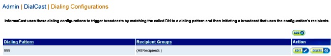 - 要将特定分机(路由模式或CTI路由点分机)关联到收件人组,请导航到Admin > DialCast > Dialing Configurations: