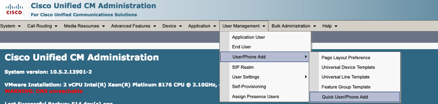 步骤1.导航至User management > User Phone Add > Quick User/Phone Add。