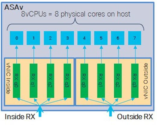 接收端扩展 - ASAv 支持接收端扩展 (RSS),网络适配器利用这项技术将网络接收流量分发给多个处理器内核。有关详细信息,请参阅用于接收端扩展 (RSS) 的多个 RX 队列。