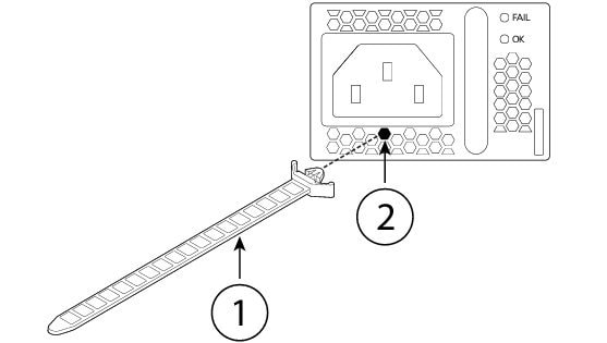 To secure the power supply module against accidental removal and thus prevent disrupting system performance, use the tie wrap and clamp provided in the accessories kit that ships with your Firepower 4100. There are two different tie wrap and clamp combinations to be used with either the Flextronics or Artesyn power supply module.