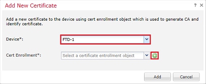 2.選擇裝置,並將證書新增到Device*下拉列表中。 然後按一下綠色+符號,如圖所示。