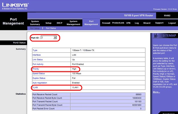 位於一個VLAN(埠1-7中的VLAN1 - 192.168.0.x)中的主機不應與RV082另一個VLAN(VLAN8 - 192.168.0.26到埠8)中的裝置通訊,同時VLAN1中的主機應比VLAN8中的客戶端具有更高的網際網路流量優先順序。出於安全原因,此處使用VLAN還用於劃分RV042、RV042G和RV082 VPN路由器上的LAN。下面列出了此過程中的各個部分: