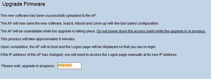 注意:升級需要幾分鐘的時間。程式完成之前,請勿重新整理。操作完成後,存取點將重新啟動並恢復正常運行。在裝置升級期間,所有連線到WAP的客戶端可能會暫時失去連線。