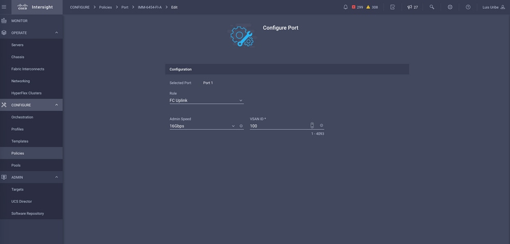 - 轉至埠角色,選擇FC上行鏈路所需的埠,然後按一下配置。