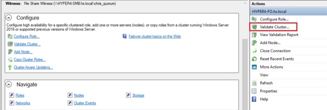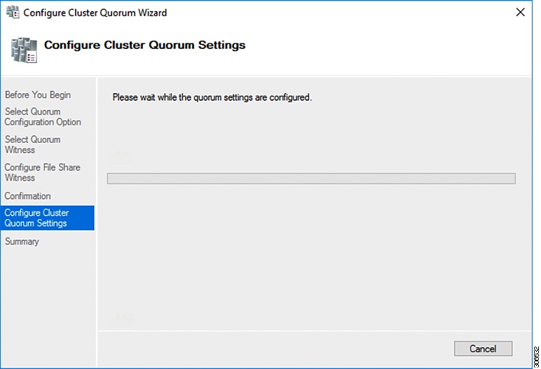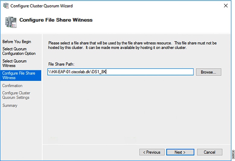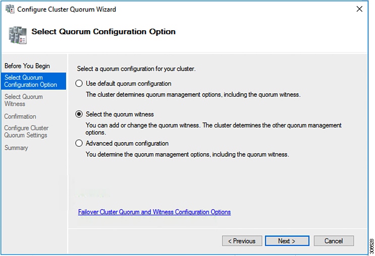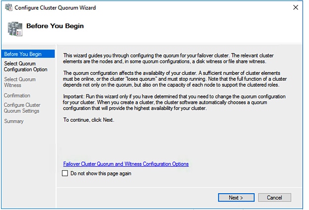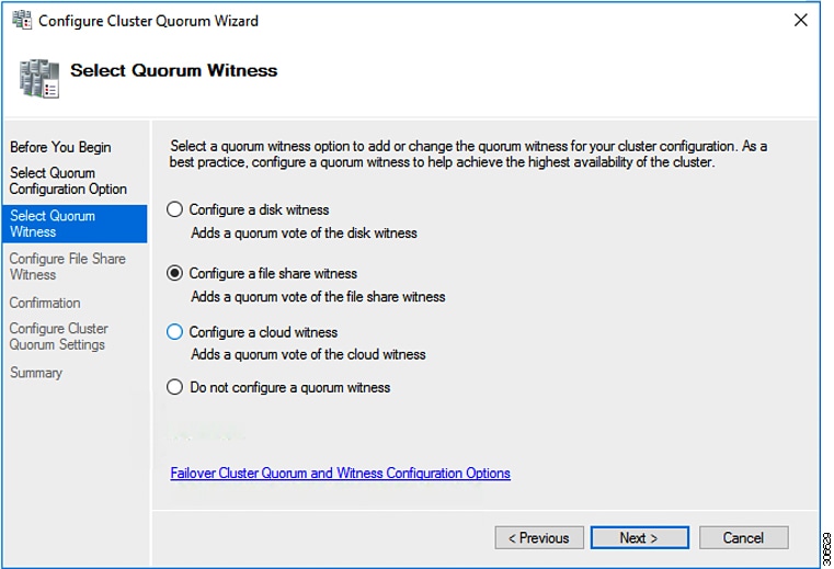 Microsoft のベスト プラクティスとして、クォーラム ウィットネス データストアを構成することを確認してください。フェールオーバー クラスタマネージャ (FCM) を使用してファイル共有ウィットネス機能を構成するには、次の手順を実行します。ファイル共有監視は、ネットワーク上のノードで障害が発生した場合に、フェールオーバ クラスタのハイアベイラビリティを保証します。具体的には、フェールオーバ クラスタ クォーラムを維持するためにファイル共有監視が必要になります。これは、ネットワーク内のパーティションとノードのサブセットが相互に通信できない場合に発生する可能性のあるスプリット ブレイン シナリオを回避するように設計されています。詳細については、「クラスタとプールのクォーラムについて」を参照してください。
