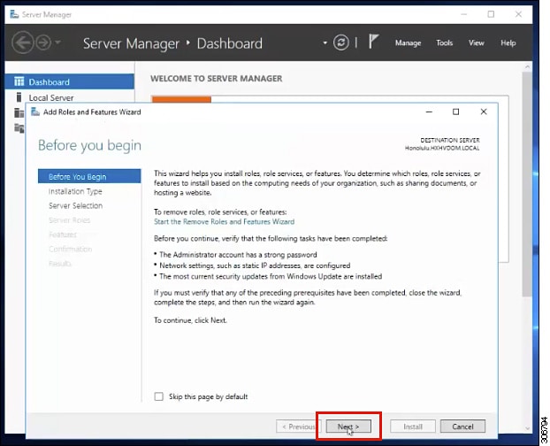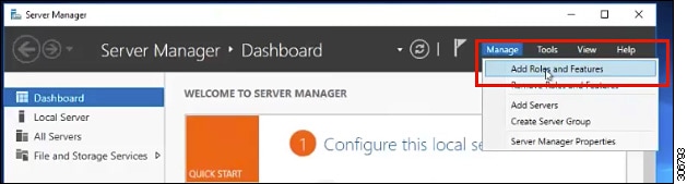 サーバ マネージャで、[Manage] をクリックして、[Add Roles and Features] を選択します。[Add Roles and Features] ウィザードが表示されます。 ![]() |