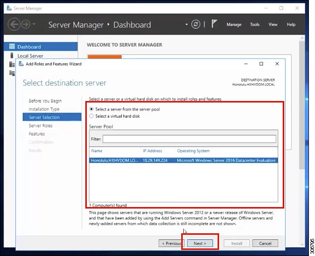 [Server Selection] ページで、リストからサーバを選択します。このサーバは、HX クラスタと同じドメインに属します。[次へ(Next)] をクリックします。 ![]() |