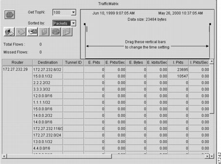 You can determine the amount of traffic the backbone handles by enabling a backbone router to track the number of packets and bytes that travel through the backbone router. You can separate the traffic into the categories "internal" and "external." You separate the traffic by designating incoming interfaces on the backbone router as internal or external. Once you enable a backbone router to collect TMS, the router starts counters, which dynamically update when network traffic passes through the backbone router. You can retrieve a snapshot of the TMS, either through a command to the backbone router or through the NDA. External traffic (path A in the figure above) is the most important for determining the amount of traffic that travels through a backbone router. Internal traffic (paths B and D in the figure above) is useful for ensuring that you are capturing all of the TMS data. When you receive a snapshot of the TMS, the packets and bytes are displayed in internal and external categories. TMS Viewing OptionsOnce TMS are collected, you have three options for viewing the data: TMS Displayed with the NDA Display ModuleThe NDA collects TMS from the backbone router and displays the data through the NDA Display module. The TMS can look similar to the data shown in the two figures below. The display format depends on the aggregation scheme you select. See the Network Data Analyzer Installation and User Guide for more information. (The view of data that the NDA Display module provides is wide. Slide the scroll bar to the right and left to see all of the data. The two figures below taken together show all of the columns of data.) Nonrecursive Accounting Information DisplayedYou can use the show ip cef command to display nonrecursive accounting information, including the counts of internal and external packets and bytes that have traveled through the IP prefix address/mask (in the format a.b.c.d/len) for an IGP route. Here is an example that shows 0 packets and 0 bytes of external traffic and 1144 packets and 742 bytes of internal traffic for the router with the IP address 10.102.102.102: