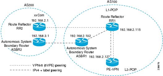 The figure below illustrates interprovider scenarios in IPv6 VPN.