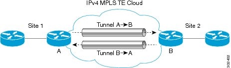 The figure below shows two IPv4-aware and IPv6-aware sites, Site 1 and Site 2, which are connected over an MPLS TE IPv4 core. MPLS TE tunnels are set up across the core between endpoints A and B. IPv6 prefixes from Site 1 are routed onto MPLS TE tunnels through edge device A and vice versa, and IPv6 prefixes from Site 2 are routed onto MPLS TE tunnels through edge device B.