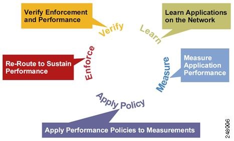 PfR Network Performance LoopEvery traditional routing protocol creates a feedback loop among devices to create a routing topology. Performance Routing infrastructure includes a performance routing protocol that is communicated in a client-server messaging mode. The routing protocol employed by PfR runs between a network controller called a master controller and performance-aware devices called border routers. This performance routing protocol creates a network performance loop in which the network profiles which traffic classes have to be optimized, measures and monitors the performance metrics of the identified traffic classes, applies policies to the traffic classes, and routes the identified traffic classes based on the best performance path. The diagram below shows the five PfR phases: profile, measure, apply policy, enforce, and verify. To understand how PfR operates in a network, you should understand and implement the five PfR phases. The PfR performance loop starts with the profile phase followed by the measure, apply policy, control, and verify phases. The flow continues after the verify phase back to the profile phase to update the traffic classes and cycle through the process. Profile PhaseIn medium to large networks there are hundreds of thousands of routes in the RIB to which a device is trying to route traffic. Because performance routing is a means of preferring some traffic over another, a subset of the total routes in the RIB has to be selected to optimize for performance routing. PfR profiles traffic in one of two ways, automatic learning or manual configuration.