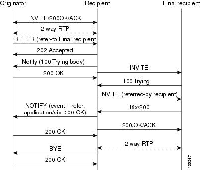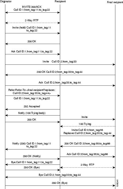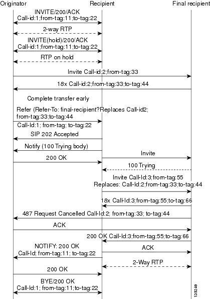 Replaces HeaderThe Replaces header is required in attended transfers. It indicates to the final recipient that the initial call leg (identified by the Call-ID header and tags) is to be shut down and replaced by the incoming INVITE request. The final recipient sends a Bye request to the originator to terminate its session. If the information provided by the Replaces header does not match an existing call leg, or if the information provided by the Replaces header matches a call leg but the call leg is not active (a Connect, 200 OK to the INVITE request has not been sent by the final-recipient), the triggered INVITE does not replace the initial call leg and the triggered INVITE request is processed normally. Any failure resulting from the triggered INVITE request from the recipient to the final recipient does not drop the call between the originator and the final recipient. In these scenarios, all calls that are active (originator to recipient and originator to final recipient) remain active after the failed attended transfer attempt The figure below shows a call flow for a successful attended transfer. Attended Transfer with Early CompletionAttended transfers allow the originator to have a call established between both the recipient and the final recipient. With attended transfer with early completion, the call between the originator and the final recipient does not have to be active, or in the talking state, before the originator can transfer it to the recipient. The originator establishes a call with the recipient and only needs to be setting up a call with the final recipient. The final recipient may be ringing, but has not answered the call from the originator when it receives a re-INVITE to replace the call with the originator and the recipient. The process for attended transfer with early completion is as follows (see the figure below):