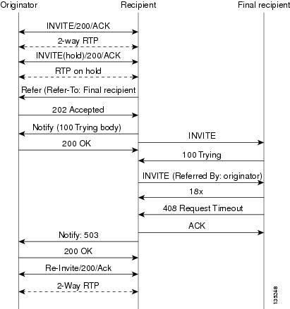 A gateway can be a recipient or final recipient, but not an originator. Blind Call-Transfer ProcessA blind, or unattended, transfer is one in which the transferring phone connects the caller to a destination line before ringback begins. This is different from a consultative, or attended, transfer in which one of the transferring parties either connects the caller to a ringing phone (ringback heard) or speaks with the third party before connecting the caller to the third party. Blind transfers are often preferred by automated devices that do not have the capability to make consultation calls. Blind transfer works as described in the Types of SIP Call Transfer Using the Refer Message Request. The process is as follows: