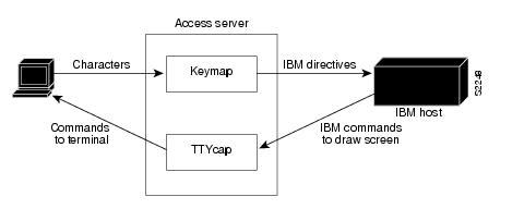 Ttycap—IBM sends commands to the terminal, including cursor position, clear screen, and so forth. The ttycap functionality on the access server changes IBM directives into the terminal language. By default, protocol translation on access servers conforms to the ANSI terminal standard, which is VTxxx terminal compatible.