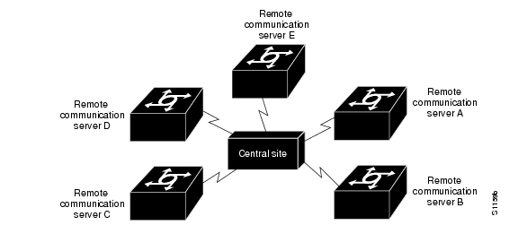 You can set up dial-on-demand (DDR) to provide service to multiple remote sites. In a hub-and-spoke configuration, you can use a generic configuration script to set up each remote connection. illustrates a typical hub-and-spoke configuration.