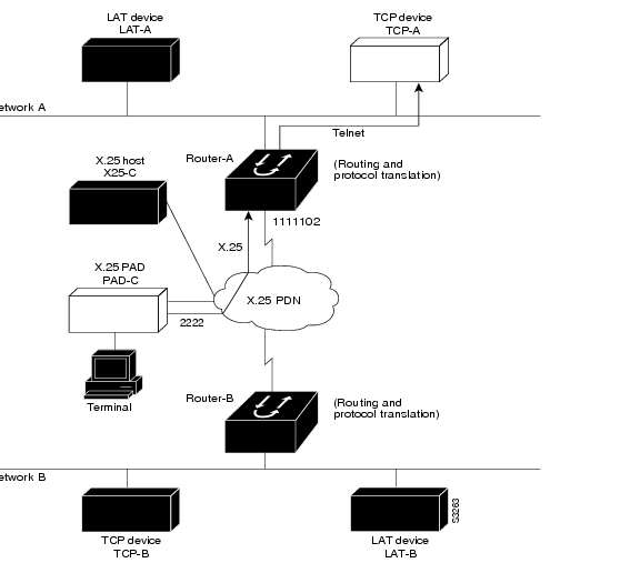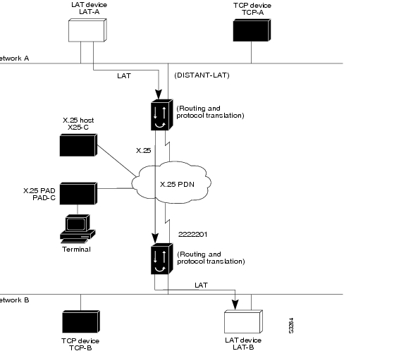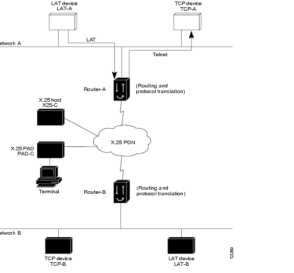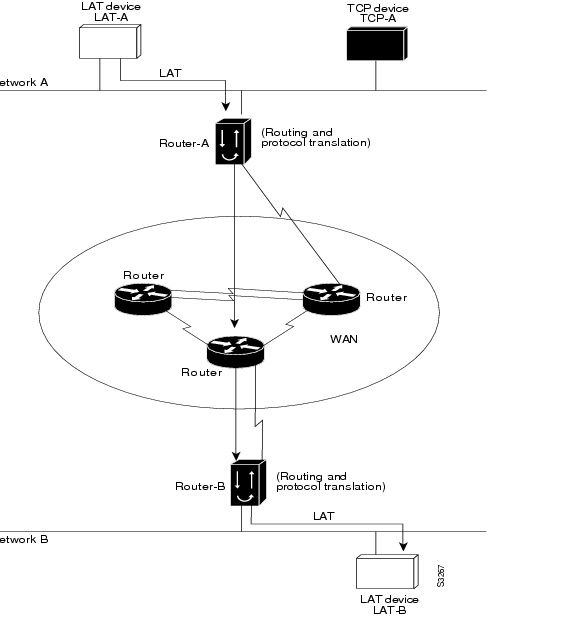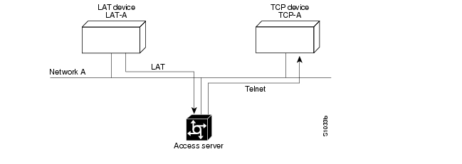 Cisco IOS software running protocol translation can translate between LAT and Telnet traffic to allow communication among resources in these protocol environments. In , the LAT device on Network A (LAT-A) is shown connecting to a device running Telnet (TCP-A).