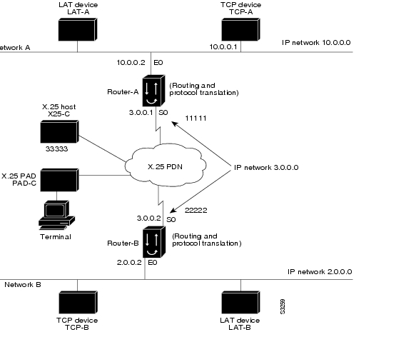 Making a translated connection from an X.25 PAD to a TCP device () is analogous to the preceding X.25 PAD-to-LAT example. Instead of translating to LAT, the configuration for routing device A includes a statement to translate to TCP (Telnet). Note that a routing device running protocol translation software can include statements supporting both translations (X.25 PAD-to-LAT and X.25 PAD-to-TCP). Different users on the same PAD can talk to X.25, LAT, or TCP devices.