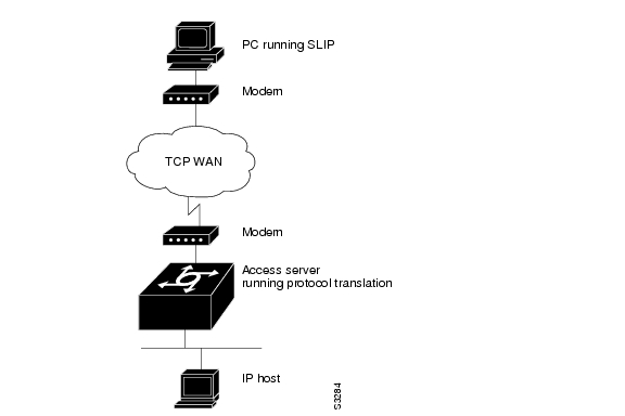 A routing device running protocol translation software can translate between TCP and SLIP traffic to allow communication among resources in these protocol environments. In , the PC running SLIP is connecting to a TCP/IP network and making a connection with the device IP host. This example enables routing and turns on header compression.