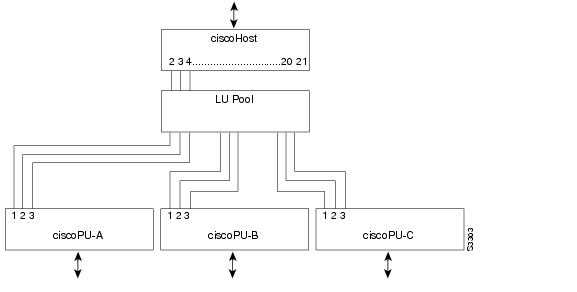 Figure 221 illustrates the use of pooled LU routing. Each upstream LU is configured in the LU pool and each downstream LU is configured as a pooled LU.
