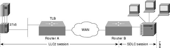 How communication sessions are established over the communication link varies depending on whether or not LLC2 local acknowledgment has been configured on Router A's Token Ring interface. In both cases, the SNA session extends end-to-end and the QLLC/X.25 session extends from Router B to the 3x74 cluster controller. If LLC2 local acknowledgment has not been configured, the LLC2 session extends from the 37x5 FEP across the Token Ring network and the arbitrary WAN to Router B. In contrast, when LLC2 local acknowledgment has been configured, the LLC2 session extends from the 37x5 FEP Router A, where it is locally terminated. A TCP session is then used across the arbitrary WAN to Router B.