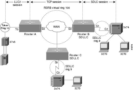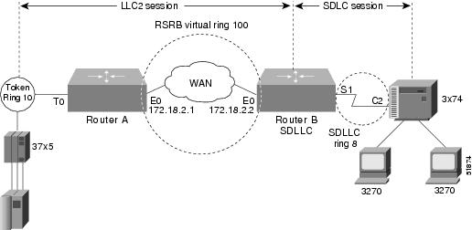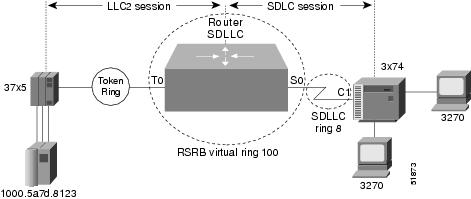 SDLLC with RSRB—A 37x5 FEP on a Token Ring and a 3x74 cluster controller connected to a serial line are connected to different routers. Only the device to which the 3x74 is connected is configured with SDLLC. The routers communicate via RSRB using direct encapsulation, RSRB over an FST connection, or RSRB over a TCP connection.