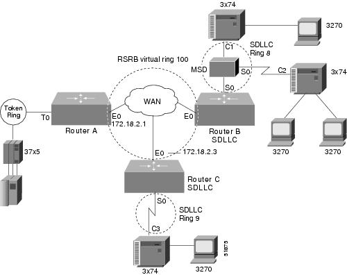 In Figure 182, notice that the arbitrary WAN and the routers on either side of it form a single virtual ring, as configured using the source-bridge ring-group global configuration command.
