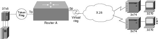 In Figure 174, each IBM end node has no indication that its counterpart is connected to a different medium running a different protocol. The 37x5 FEP responds as if the 3x74 cluster controller were communicating over a Token Ring, whereas the 3x74 responds as though the 37x5 FEP were communicating over an X.25 network. This is accomplished by configuring the router's X.25 interface as a virtual Token Ring, so that the X.25 virtual circuit appears to the Token Ring device (and to the router itself) as if it were a Token Ring to which the remote X.25 device is attached.