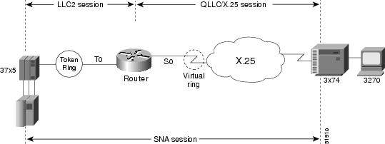 Also in this figure, the LLC2 connection extends from the 37x5 FEP across the Token Ring network to the router. The QLLC/X.25 session extends from the router across the X.25 network to the 3x74 cluster controller. Only the SNA session extends across the Token Ring and X.25 networks to provide an end-to-end connection from the 37x5 FEP to the 3x74 cluster controller.