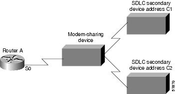 Figure 168 Two SDLC Secondary Stations Attached to a Single Serial Interface Through a Modem-Sharing Device