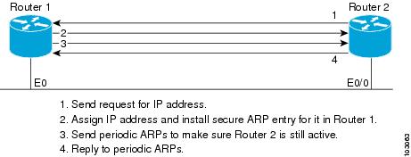 Router 1 is the DHCP server that assigns IP addresses to the routers that are seeking IP addresses, and Router 2 is the DHCP client configured to obtain its IP address through the DHCP server. Because the update arp DHCP pool configuration command is configured on Router 1, it will install a secure ARP entry in its ARP table. The arp authorized command stops any dynamic ARP on that interface. Router 1 will send periodic ARPs to Router 2 to make sure that the client is still active. Router 2 responds with an ARP reply. Unauthorized clients cannot respond to these periodic ARPs. The unauthorized ARP responses are blocked at the DHCP server. The timer for the entry is refreshed on Router 1 upon receiving the response from the authorized client.