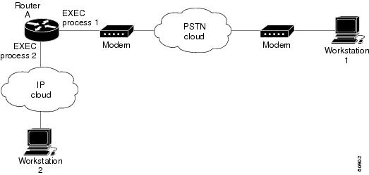 Figure 1 shows a common scenario for asynchronous character mode traffic that involves a remote user on Workstation 1 dialing in to an asynchronous port on Router A (a Cisco router or access server). The user commands are interpreted by an EXEC process (such as EXEC process 1). To monitor the inbound or outbound asynchronous traffic on this port, you must log in to Router A via another terminal line—for example, a vty when logging from Workstation 2—and enter the monitor traffic line command. This command is interpreted by a second EXEC process (such as EXEC process 2).