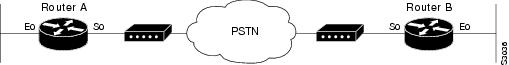 The following example shows Router A and Router B connected to a Public Switched Telephone Network (PSTN). Router A is configured for DTR dialing. Remote Router B is configured for in-band dialing so it can disconnect an idle call. (See Figure 2.)