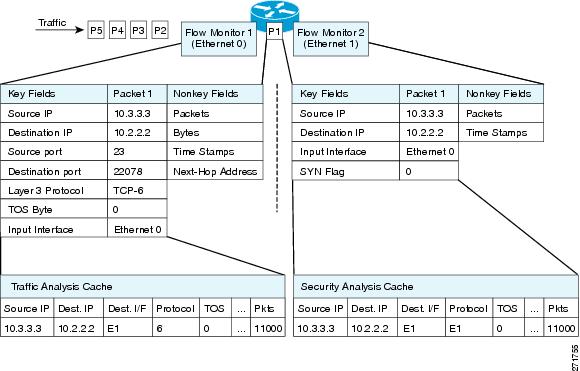 Flexible NetFlow can be used to perform different types of analysis on the same traffic. In Figure 3, packet 1 is analyzed using a record designed for standard traffic analysis on the input interface and a record designed for security analysis on the output interface.