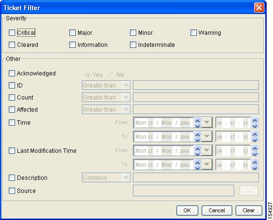 Cisco ANA NetworkVision enables you to define a filter for the tickets displayed in the ticket pane according to various criteria; for example, tickets can be filtered according to the number of affected parties or acknowledged tickets.