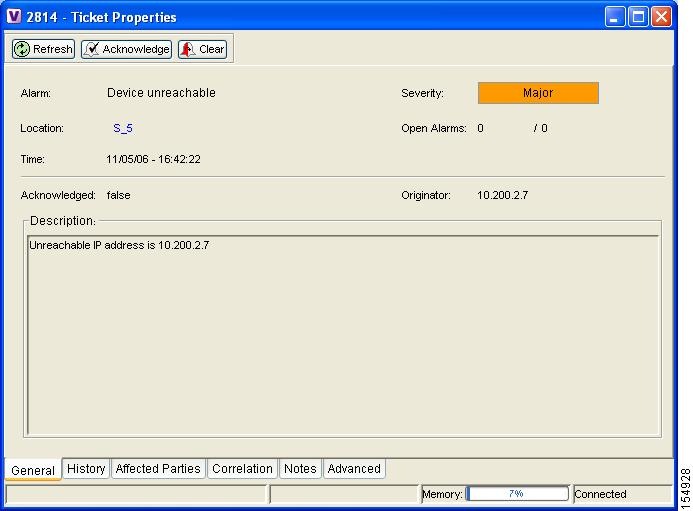 When an alarm occurs a warning or ticket is displayed in the ticket pane. Cisco ANA NetworkVision enables you to handle the reported ticket by verifying the report of what is faulty and clearing the faulty network element. The change is reported to the Cisco ANA Gateway and all open Cisco ANA NetworkVision applications. This operation cannot be reversed.