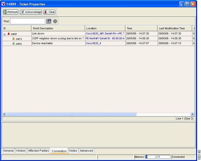 This chapter describes how Cisco ANA NetworkVision correlates alarms and how to view the tickets and ticket properties, including correlated alarms, active alarms and alarm history. In addition, it describes ticket management, for example, acknowledging a ticket.