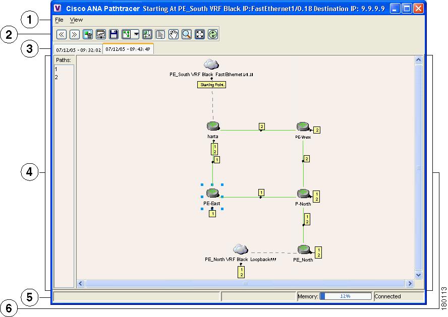 For more information about opening the Cisco ANA PathTracer from other Cisco ANA NetworkVision windows, and selecting multi-path options, refer to the section on Viewing Multi-Path Routes in VPN Networks in the Cisco Active Network Abstraction Managing MPLS User Guide.