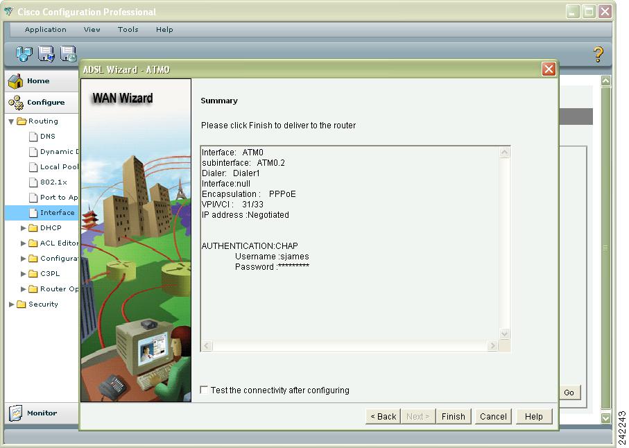 To complete the wizard, use the Next button to move to subsequent screens and complete them. When you have entered all required values, the wizard displays the summary screen. This screen displays the values that you have entered. Figure 22 shows the ADSL Connection Summary screen.