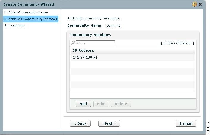 To create the community entry, you must provide the IP address and login credentials of a device that you want to add to the community. The username that you specify must have a privilege level of 15.