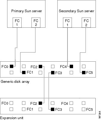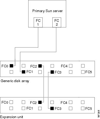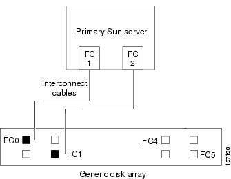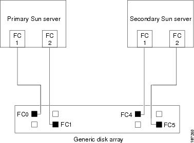 Connect the fiber cables on the generic disk storage array to the Sun servers as shown in Figure 2-1, Figure 2-2, Figure 2-3, or Figure 2-4, depending on your cluster configuration. There are two fiber channel paths to each Sun server from the generic disk storage arrays.