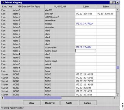 The first three columns in the VLAN/ELAN Subnet Mapping Table contain text that cannot be edited. The column headings are Entry Type, VTP Domain/ATM Fabric, and VLAN/ELAN. You can edit the text in any Subnet column.