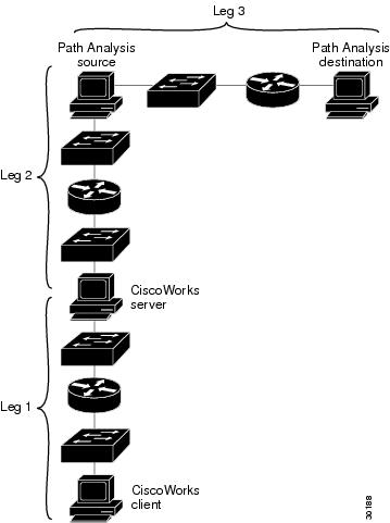 Path Analysis investigates and reports on Layer 3 and Layer 2 paths between a source and destination (Leg 3 in Figure 5-2). For Path Analysis to be able to perform this analysis on Leg 3, Legs 1 and 2 must be functional.